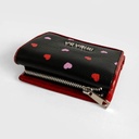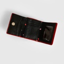 | Aplicaciones | Billetera de 3 cuerpos. Capacidad para 4 tarjetas. Bolsillo externo con cierre para efectivo. Tapa rectangular con ribete rojo charol. Herrajes, broche y accesorios plateados. |