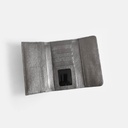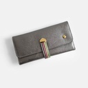 | Aplicaciones | Billetera de 3 cuerpos. Capacidad para 10 tarjetas. 3 compartimentos grandes. Bolsillo externo con cierre para efectivo. Correa para cerrar la billetera conformado por tiras metalizadas de color rosado, verde, dorado y plateado. Herrajes, broche y accesorios dorados. |