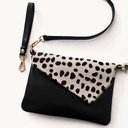 Detalles | Tapa esquinada con cuero tipo piel color blanco con manchas negras. Cierre y accesorios color dorado Bolsillo interno Broche imantado |