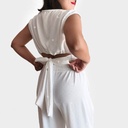 En la blusa tiene un detalle de un lazo para ajustar en la parte posterior y un pequeño escote.
