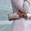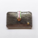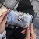 Correa para cerrar el monedero conformado por tiras metalizadas de color fucsia, verde, dorado y plateado.