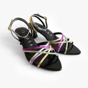 Aplicaciones | Acabado en punta. Tiras de 5 colores metalizados que forman una estrella. Hebilla cuadrada para ajustar en el tobillo |